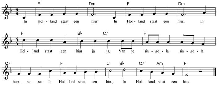 staat een huis. In Holland stands a house, In Holland stands a house, In Holland stands a house ha ha, With a tingela tingela hopsasa, In Holland stands a house, In Holland stands a house. In dat