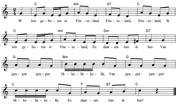 Now I was born in Frieseland, Frieseland, Frieseland, I was born in Frieseland, And that's why I am here. Sing jampot, jampot, lick-a-lick-a-lick, Sing jampot, jampot, lick-a-lick-a-lick, And that's why I am here. My